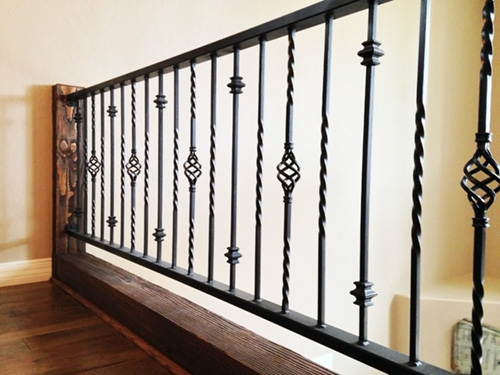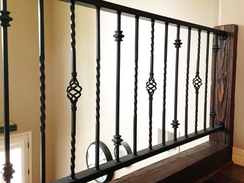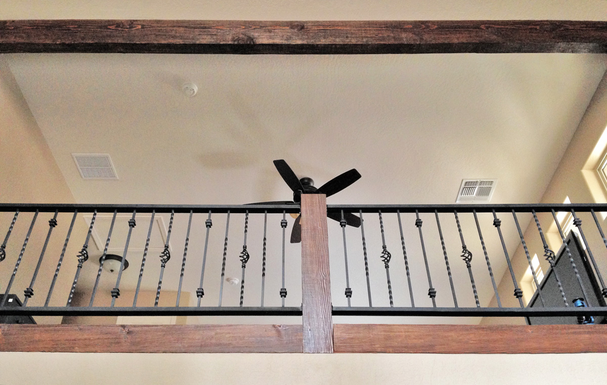 We added custom wrought iron railing and heavy lumber to this loft area in our customer's home.
